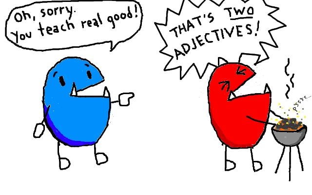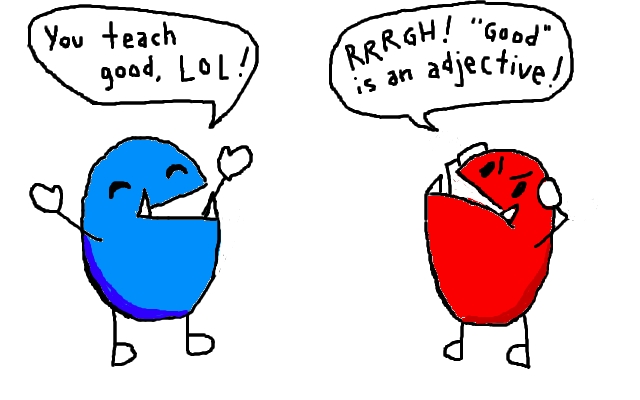 Converting an adjective into an adverb of manner normally requires adding “–ly” to the adjective (e.g. “quick” / “quickly”, “slow” / “slowly”, “nice” / “nicely” etc). A few adverbs of manner, however, are irregular, i.e. they are not changed from adjective to adverb this way (such as “fast”, and “hard”). The fact that the most common adjective in English – good – is irregular causes all sorts of grating grammar mistakes that make me want to burn my hands off: