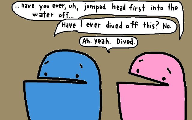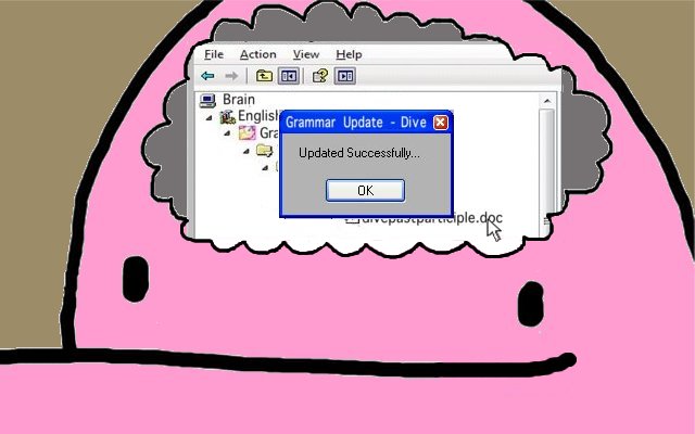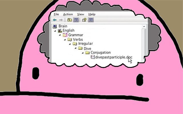 Your illustration completely encapsulates the way my little brain works. And I have thusly (a word?) updated my database about the correct conjugation of “to dive.” Thank you! Your updates are much more seamless than Microsoft’s.