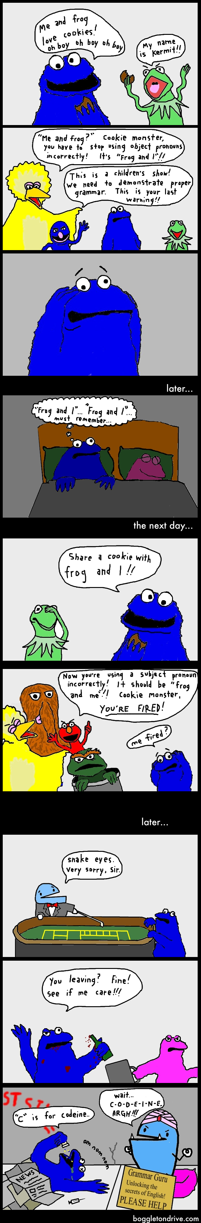 I’ve always thought that it was odd that Cookie Monster was so prominently featured on a children’s TV show despite his poor usage of pronouns.
